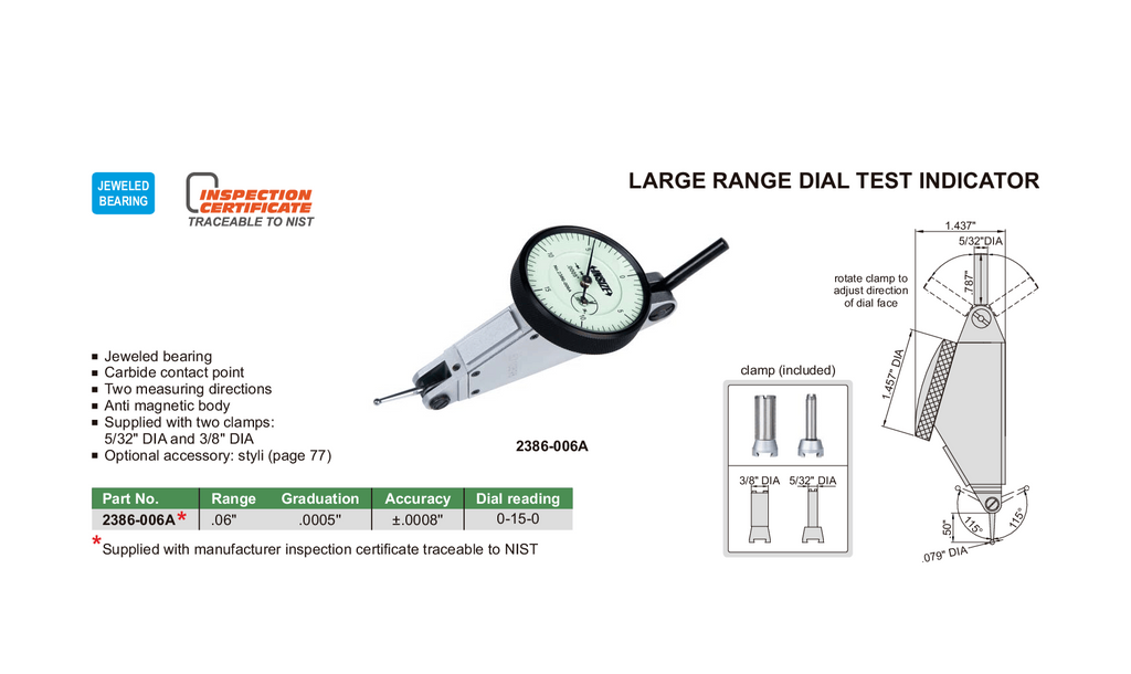 LARGE RANGE DIAL TEST INDICATOR | 0 - 0.06" x 0.0005" | INSIZE 2386-006A