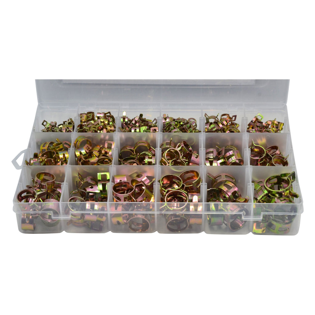 Ensure you're prepared for any hose fitting task with our expertly curated 422-Piece Spring Hose Clamp Assortment Kit. This comprehensive kit includes a variety of constant tension spring band clamps, designed to securely attach hoses to fittings. Perfect for vacuum hose lines, water, and low-pressure oil lines, this kit is a must-have addition to any toolbox for automotive, industrial, or home projects.