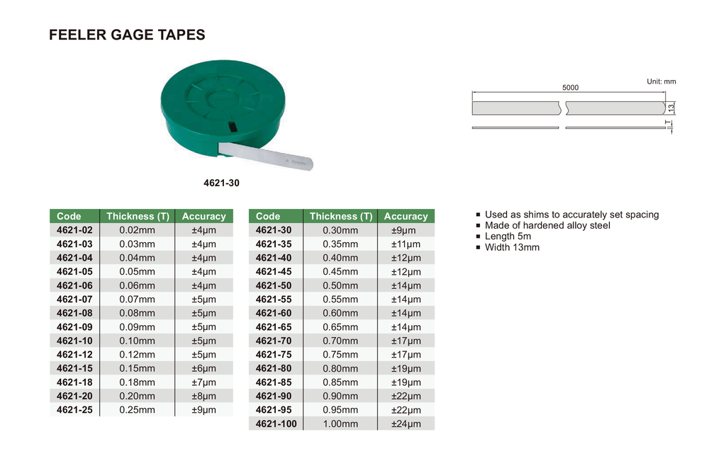 Well designed, durable high precision tools that are suitable for various measuring ranges. INSIZE feeler gauge tape is the perfect instrument to accurately set spacing. Easy to use feeler gauge tape used as shims for accurate measurement.