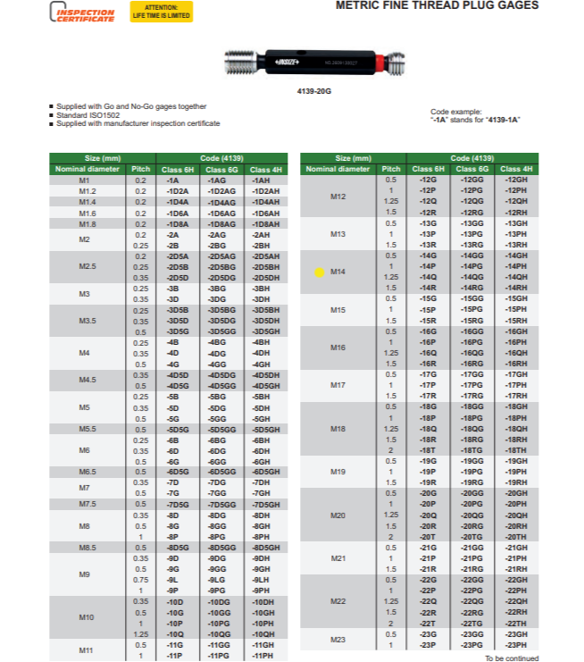 M14 X 1.5 THREAD PLUG GAUGE - 4139-14R