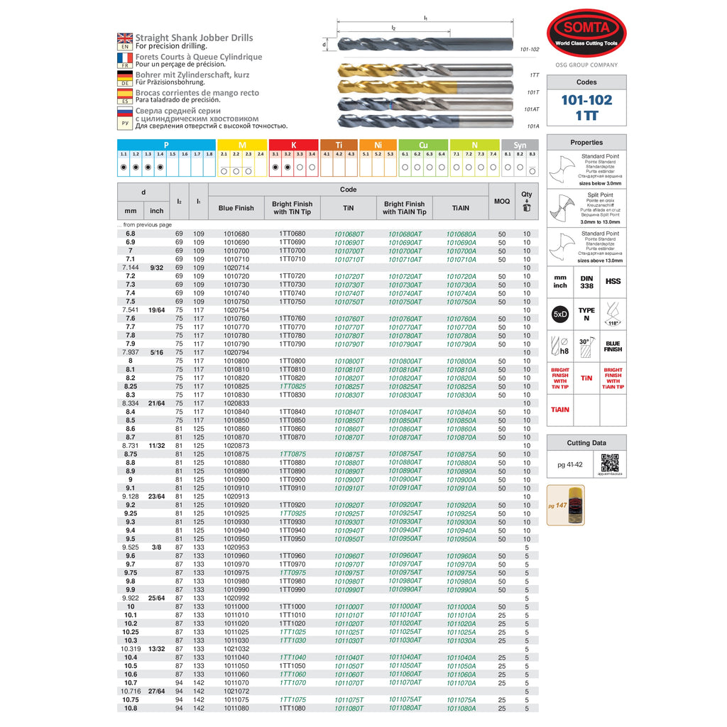 The SOMTA 1011050 – 10.5 mm HSS Jobber Drill Bit is a high-precision twist drill bit designed for professional drilling in metals, plastics, wood, and other general-purpose materials. Featuring a jobber-length design and built from high-speed steel (HSS), this drill bit delivers excellent toughness and heat resistance. The 118° split-point tip ensures fast, accurate starts and helps minimize walking on contact, while the blue oxide finish reduces friction, enhances chip flow, and extends tool life.