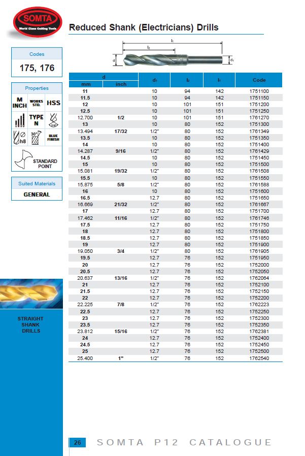 The SOMTA 1751400 – 14mm HSS Reduced Shank Drill is a precision-engineered cutting tool designed to drill larger diameter holes using machines with standard 12.7mm (½″) chucks. Manufactured from high-speed steel (HSS), this drill bit features a reduced shank and a standard 118° point angle for accurate centering and smooth drilling across a variety of materials including mild steel, cast iron, and non-ferrous metals.
