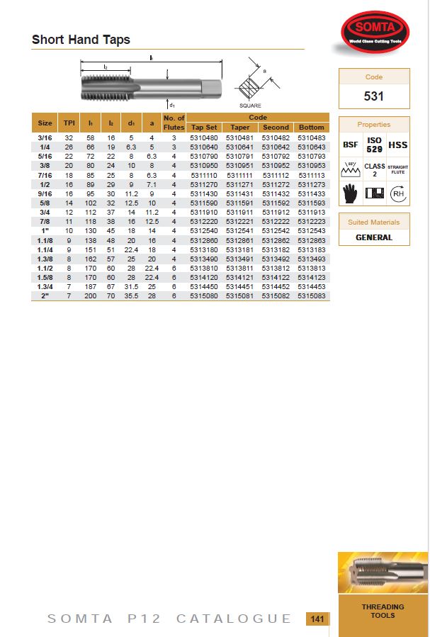 The SOMTA 5311273 is trusted for critical threading work in precision applications. Whether in a workshop or maintenance environment, its HSS durability and bottoming design make it an essential tool for tapping blind BSF holes to full depth.