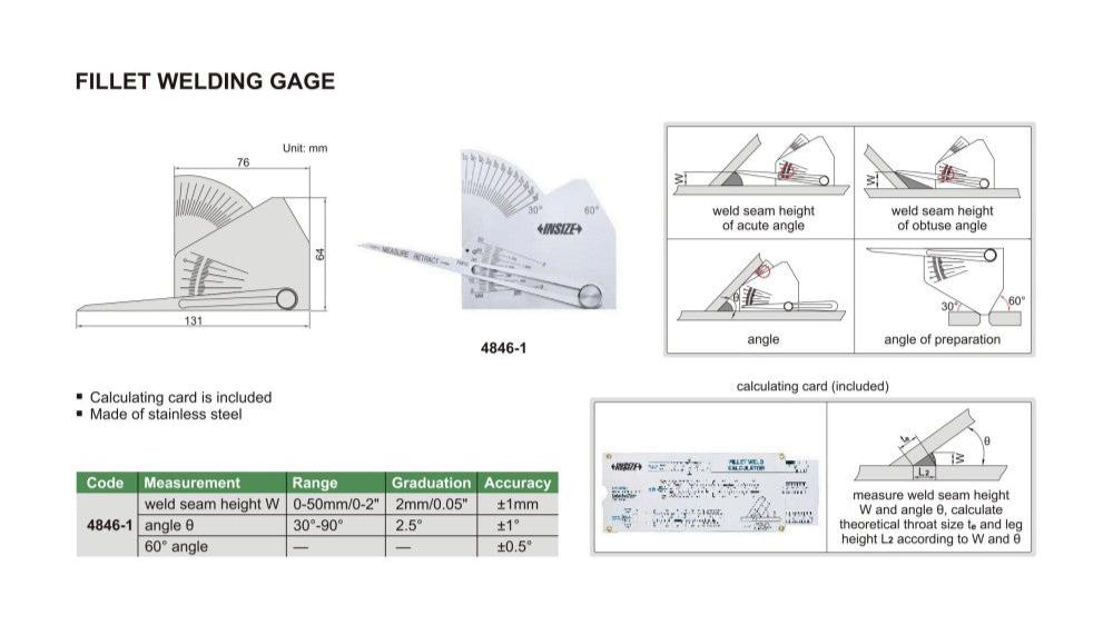 Well designed, durable high precision tools that are suitable for various measuring ranges. INSIZE fillet welding gauges are the perfect instrument for measuring a wide range of welds. Easy to use fillet weld gauge for measuring fillet weld size and throat thickness quickly and accurately.
