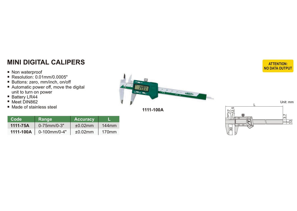 MINI DIGITAL CALIPER - INSIZE 1111-75A 0-75mm / 0-3"