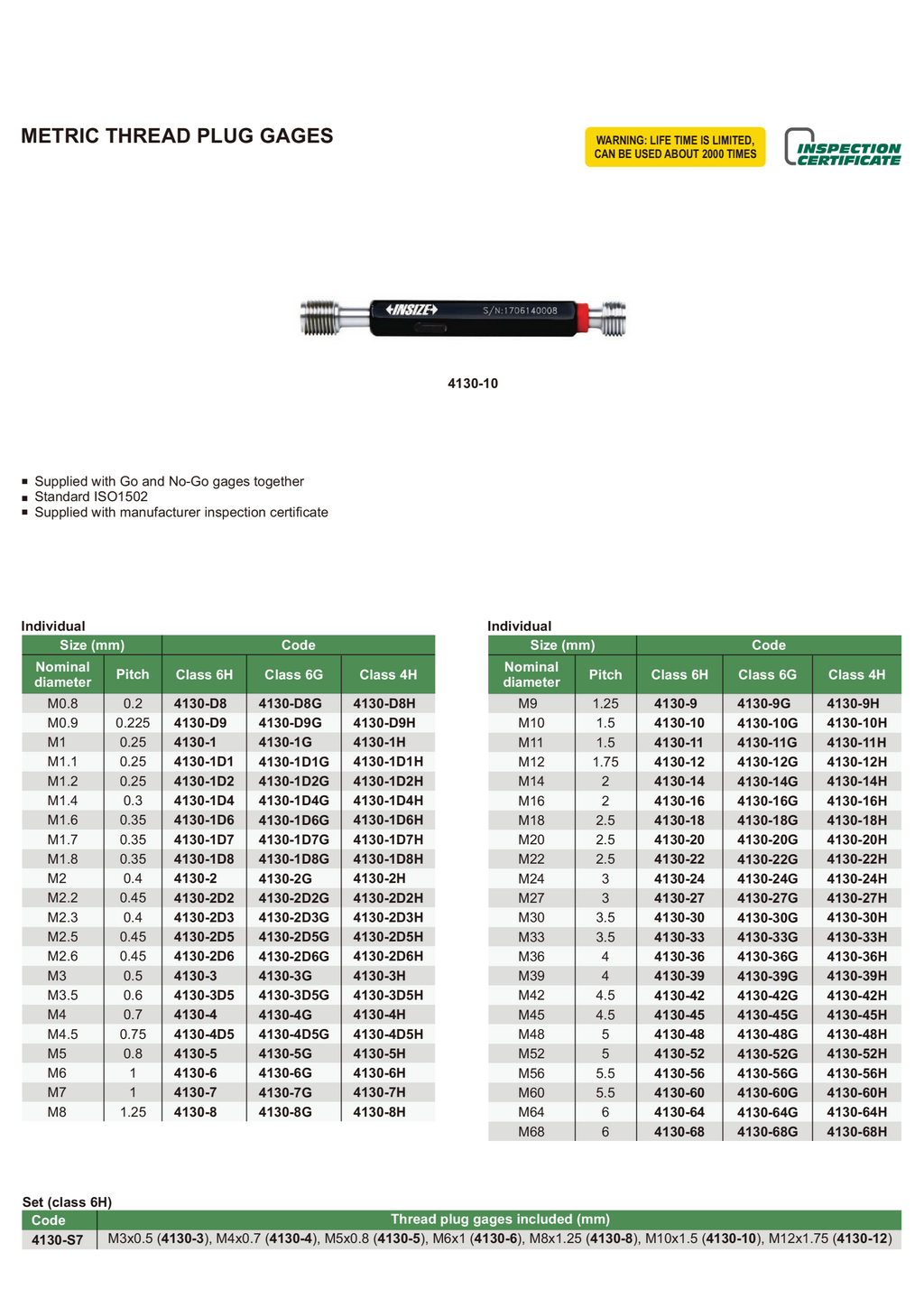 • Supplied with Go and No-Go gauges together