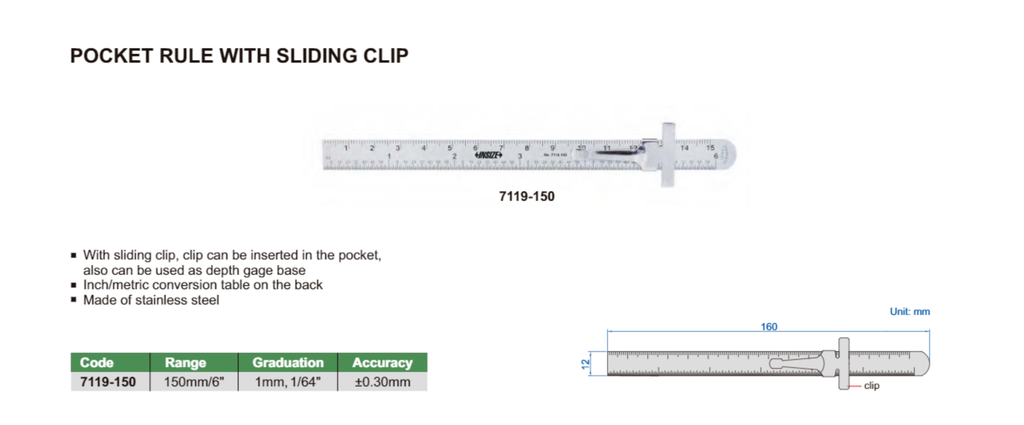 Well designed, durable high precision tools that are suitable for various measuring ranges. INSIZE pocket rules are the perfect instruments for measuring a wide range of components. Easy to use pocket made of hardened steel with sliding clip.
