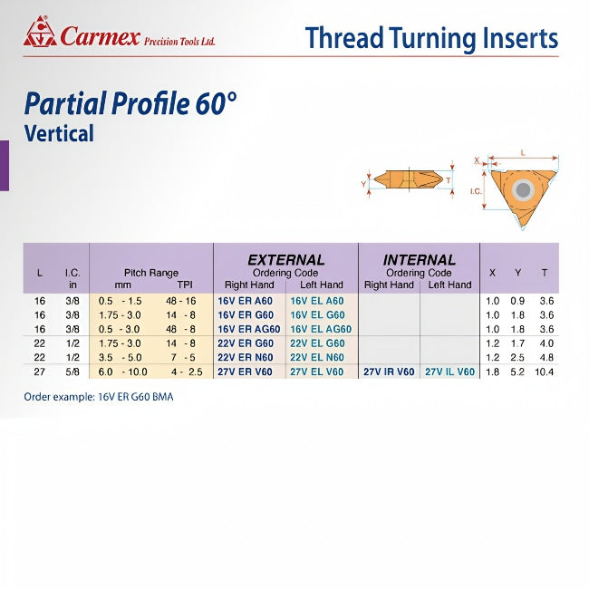 The 22V ER G60 BLU is a high-performance external threading insert designed for vertical partial profile threading applications with a 60° included angle. Supporting a pitch range from 1.75 mm to 3.0 mm (14–8 TPI), this insert is ideal for threading operations that require flexibility across multiple thread sizes while maintaining high accuracy and reliability.