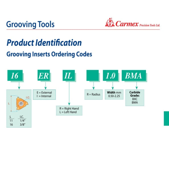 This Carmex grooving insert for snap ring applications is engineered to deliver precise and durable grooves using standard Carmex thread turning toolholders. Suitable for both external right-hand and internal left-hand (or vice versa) operations, it provides flexibility and reduces tooling requirements. With a 16 mm (3/8") insert size and support for anvils AE 16-0 or AI 16-0, this insert ensures secure positioning and efficient chip control ideal for snap ring grooves in a wide variety of components.