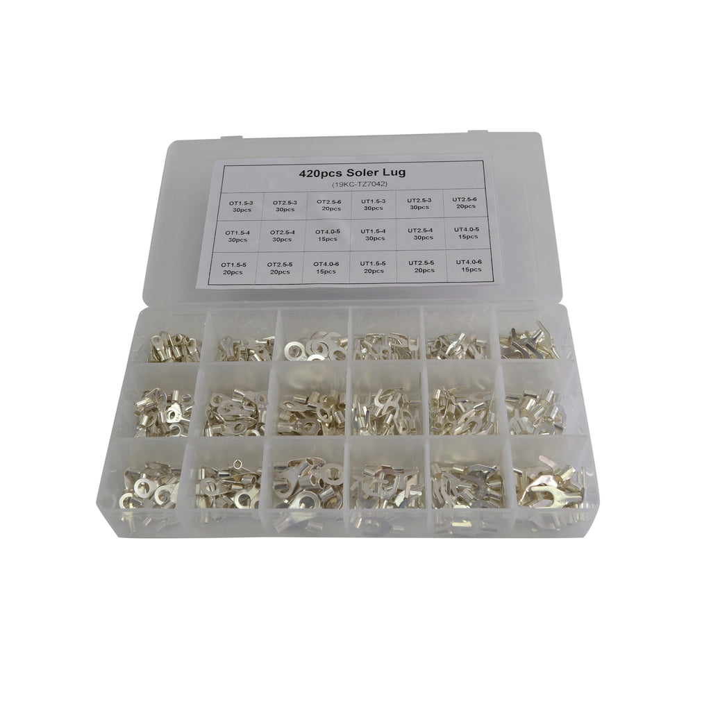 Ensure you're prepared for any electrical task with our expertly curated 420-Piece Terminal Solder Lug Assortment Kit. This comprehensive kit includes a variety of durable non-insulated crimp terminals, designed for reliable electrical connections. Made from tin-plated copper, these terminals ensure excellent conductivity. Perfect for automotive, industrial, and home electrical projects, this kit is a must-have addition to any toolbox.