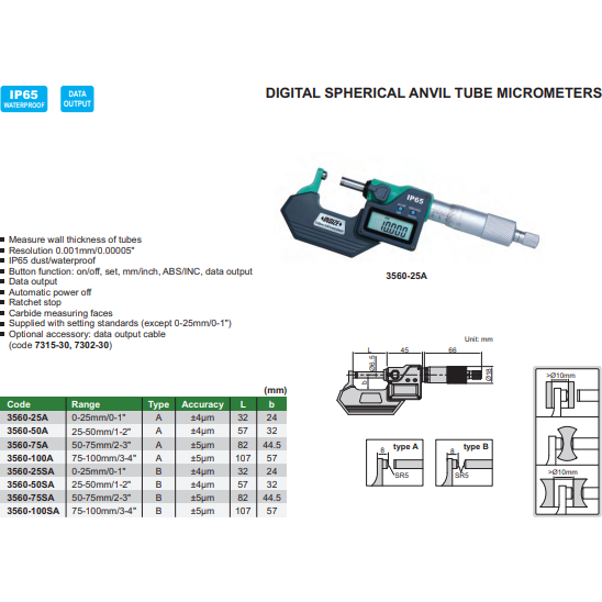 50-75MM DIGITAL SPHERICAL TUBE ANVIL MICROMETER- 3560-75A
