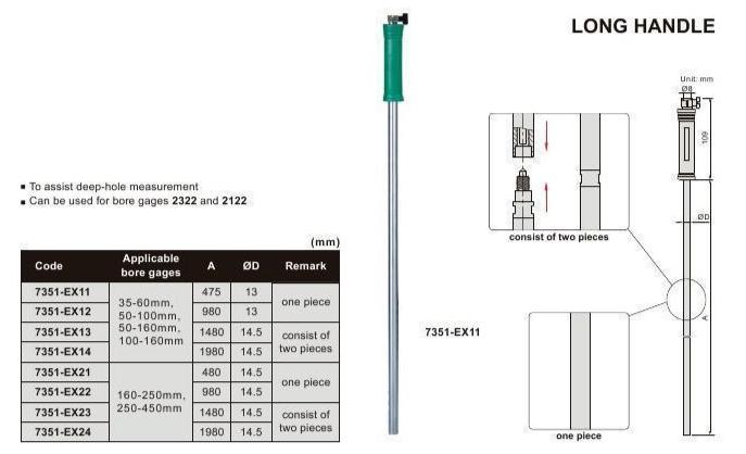 Well designed, durable high precision tools that are suitable for various measuring ranges. INSIZE long handles are the perfect instrument to assist bore gauges in recording accurate measurements. Easy to use and adjust bore gauge to assist in deep hole measurement.