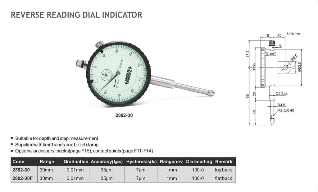 REVERSE READING DIAL INDICATOR | 0 - 30mm x 0.01mm | INSIZE 2802-30