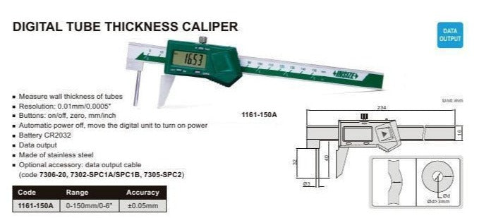 DIGITAL TUBE THICKNESS CALIPER - INSIZE 1161-150A 0-150mm / 0-6"