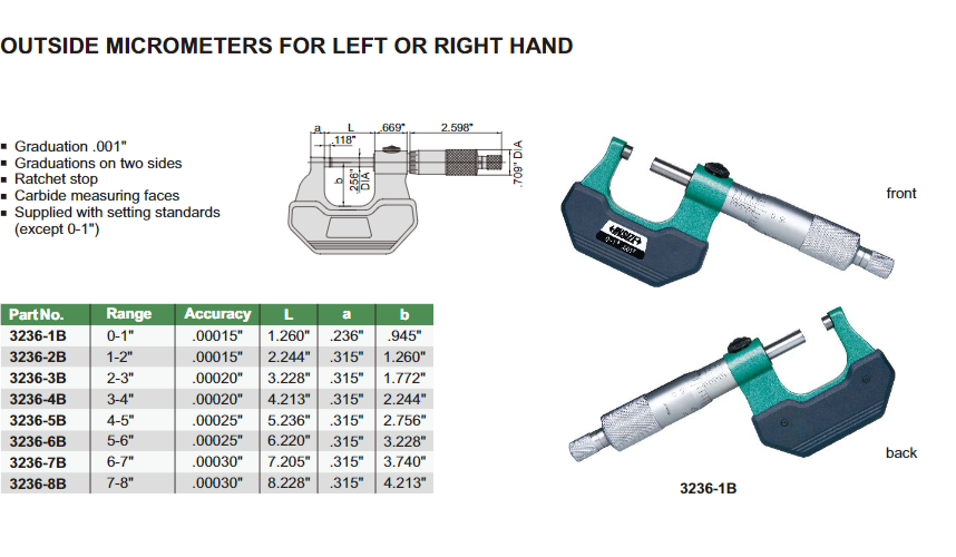 LEFT/RIGHT HAND OUTSIDE MICROMETER - INSIZE 3236-1B