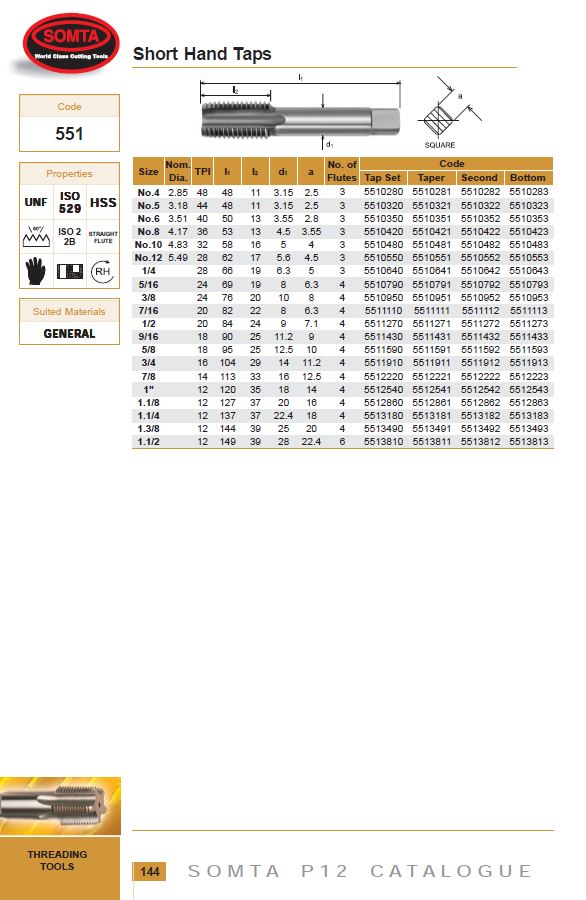 SOMTA – Series 551 HSS UNF Thread Tap 3/4″ Intermediate – Short Hand Tap