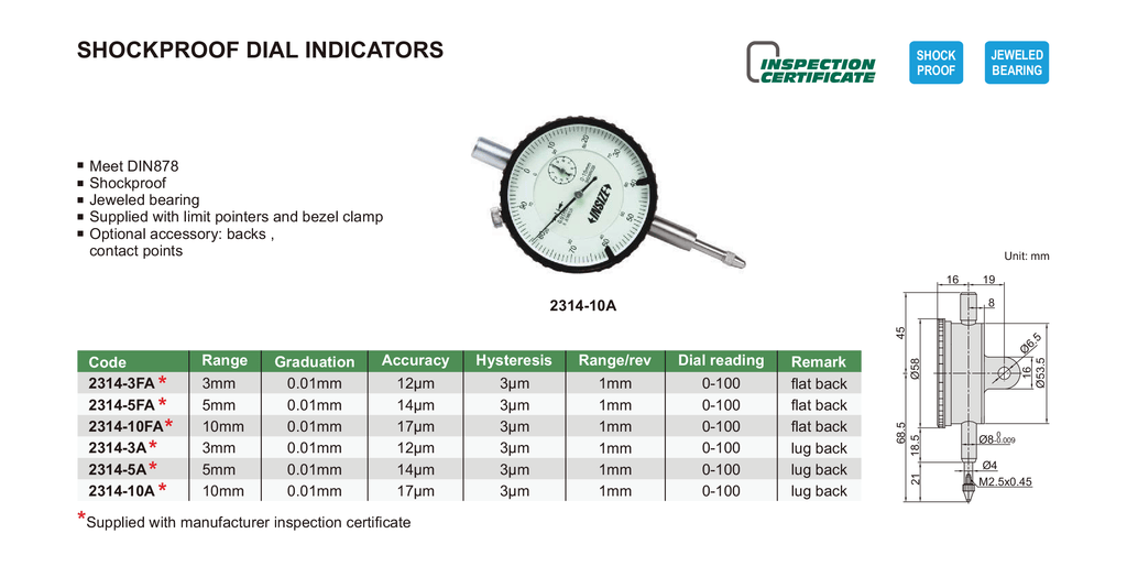 5MM DIAL INDICATOR SHOCKPROOF INSIZE 2314-5A