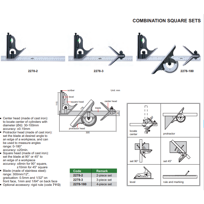 INSIZE combination squares are the perfect instrument for measuring a wide range of components. Easy to use and adjust combination square set for checking 90 degree and 45 degree angles.