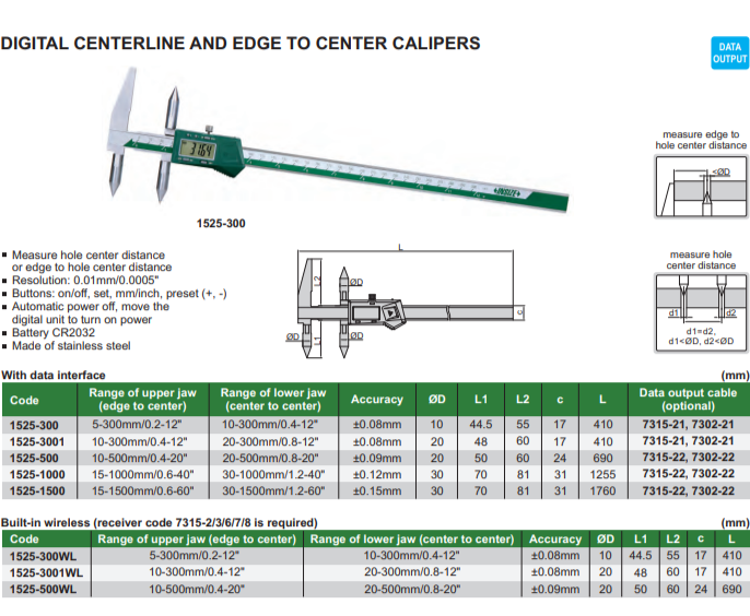 Well designed, durable high precision tools that are suitable for various measuring ranges. This precision instrument is perfect for measuring small distances and make them visible to the user. Easy to use and adjust digital centerline caliper to measure hole center distance in the same or offset planes.