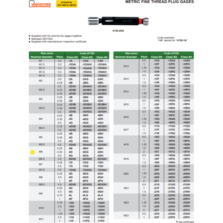 M6x0.75mm | Fine Thread Plug Gauge | 4139-6L