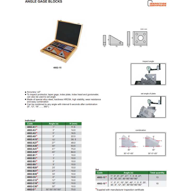 Well designed, durable high precision tools that are suitable for various measuring ranges. INSIZE angle gauges are the perfect instrument for measuring a wide range of angles. Easy to use angle gauges allow for the quick measurement of angles with high precision.