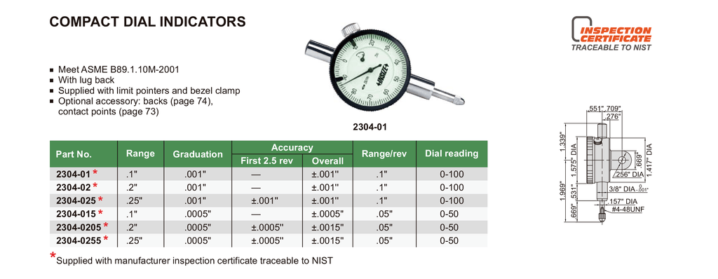 COMPACT DIAL INDICATOR - INSIZE 2304-0205 0.2"